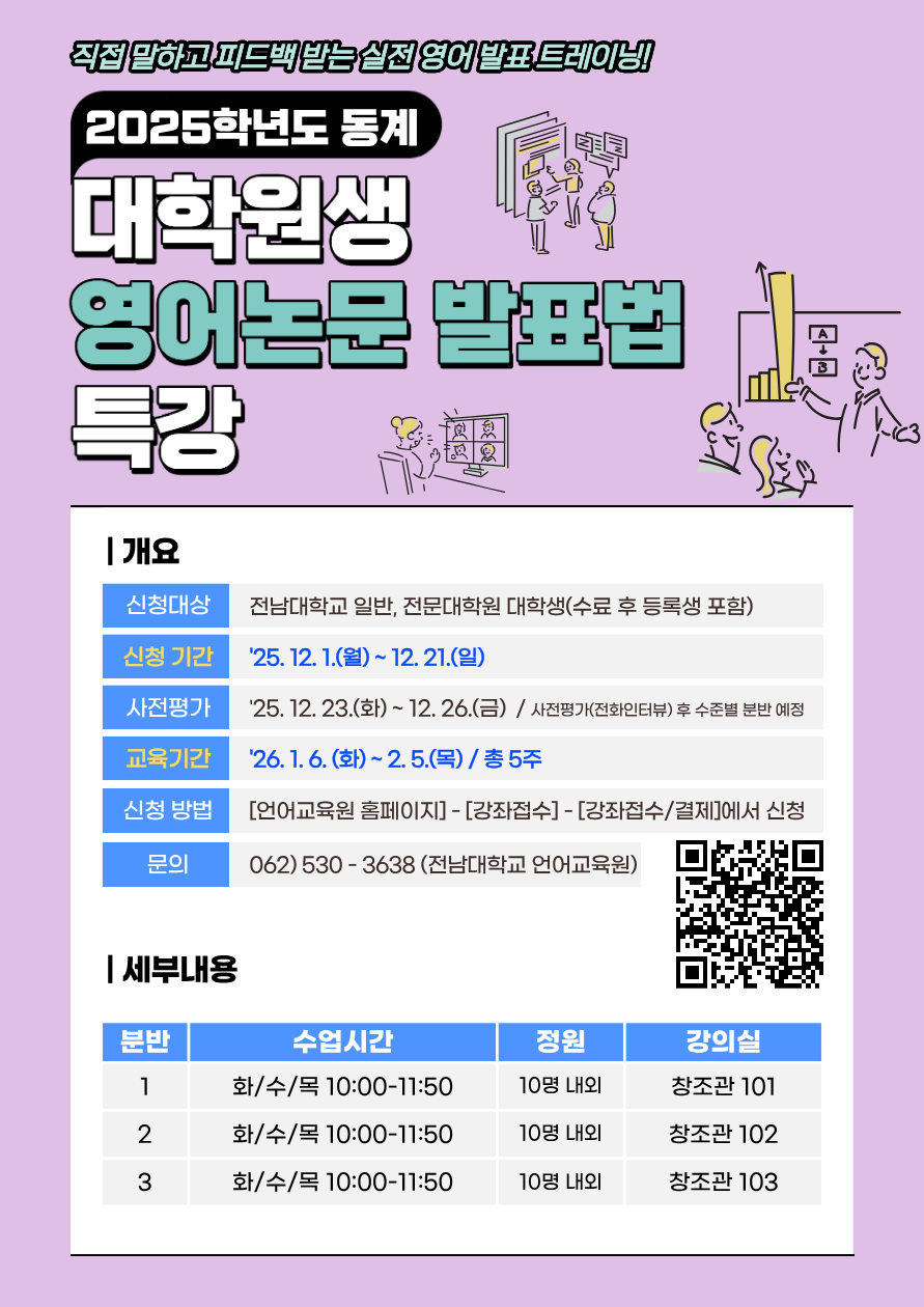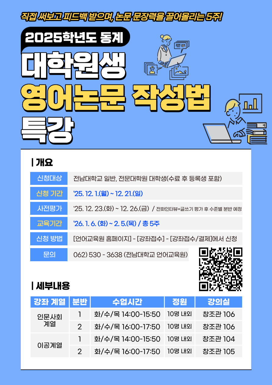 전남대학교 언어교육원에서 대학원생 영어 논문 작성 및 발표 능력 향상을 위한 국제화 역량강화 프로그램을 다음과 같이 운영하오니 많은 관심과 참여 부탁드립니다.