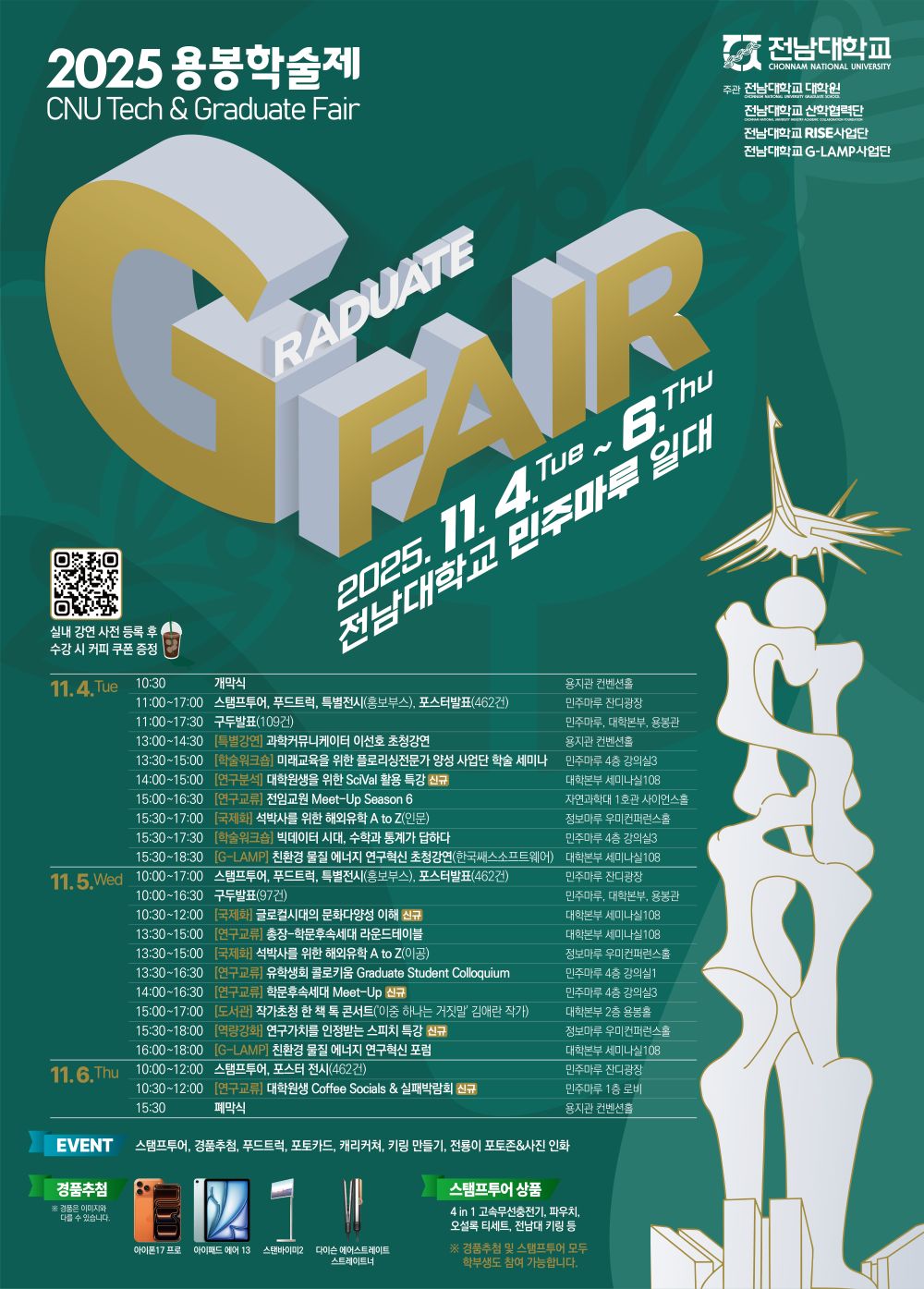 전남대 용봉학술제(CNU Tech & Graduate Fair)가 11월 4일(화) ~ 11월 6일(목) 3일간 전남대 광주캠퍼스 전역에서 개최됩니다.
