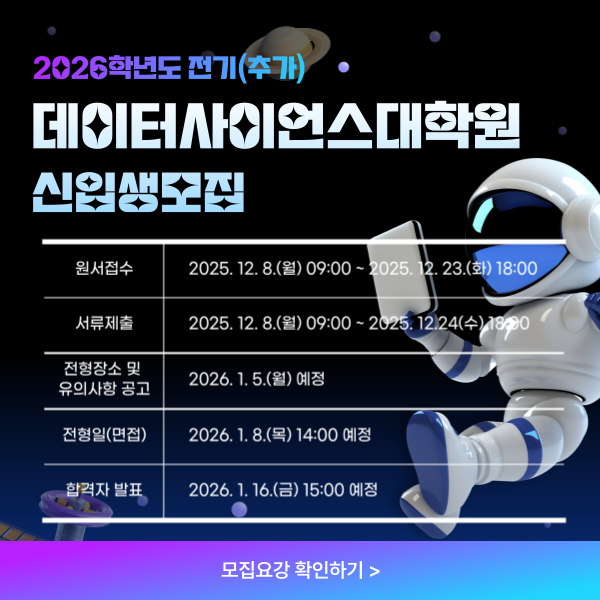 우리 데이터사이언스대학원은 인문사회·경제·자연과학·농업·예술·스포츠 등 다양한 분야의 전문 지식과 데이터 활용·분석 능력을 기반으로 4차 산업혁명시대가 요구하는 융복합 인재를 양성하고자 합니다.